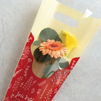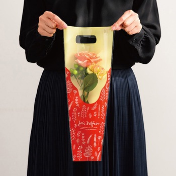 赤地にボタニカル柄デザインが入ったおしゃれな1~3輪用のハンドル付の花用OPPギフトバッグです。