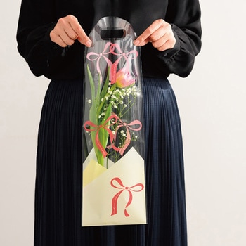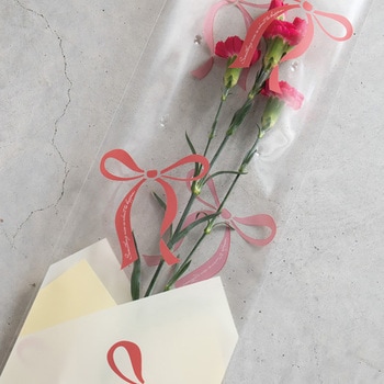 シンプルな赤いリボン柄が人気の1~2輪用の花用OPPギフトバッグです。
