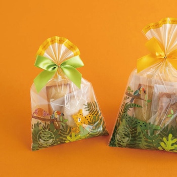 ジャングルからやってきた可愛い動物たち(鳥、アルマジロ、ヒョウ)が描かれたOPP袋です。