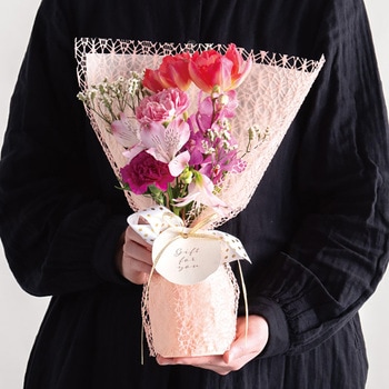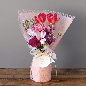 そのまま飾れるスタンディングブーケにおすすめのピンク系のラッピング資材です。