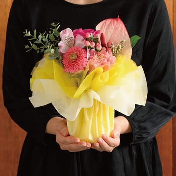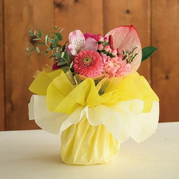 そのまま飾れるスタンディングブーケにおすすめのイエロー系のラッピング資材です。