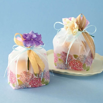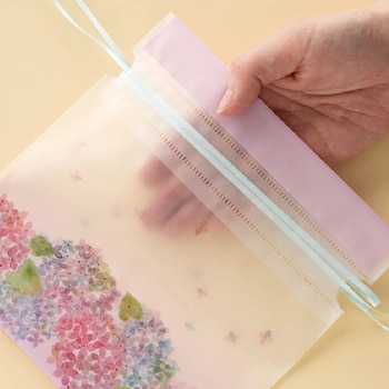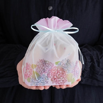 ほんのり透ける素材がオシャレなあじさい柄の巾着バッグです。