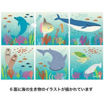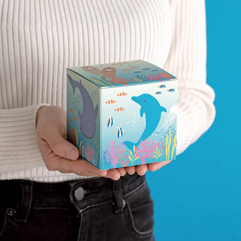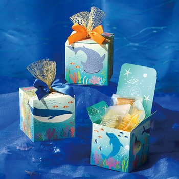 可愛い海の生き物のイラストをあしらったブルーのキューブ型ギフトボックスです。
