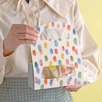カラフルな水彩のドット柄が爽やかなバッグ型のハンドル付ギフトボックスです。
