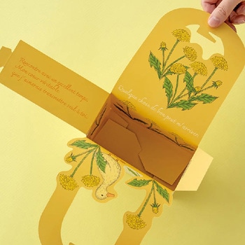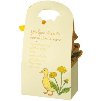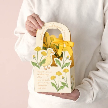 アヒルとタンポポをあしらった薄いイエローのハンドル付ギフトボックスです。