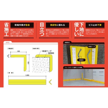 鋼製アングルの埋め込みやビス止め施工の出隅材と比較し施工工数の削減が可能です。(両面テープ・接着剤施工)また、現場での切断も簡単に行えます。