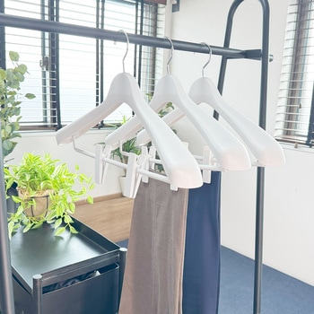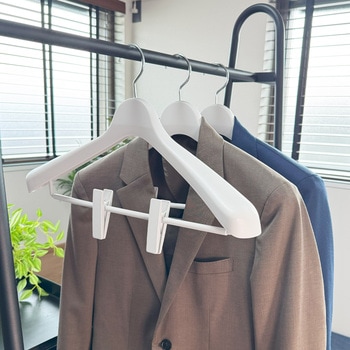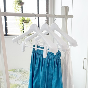 40センチのジャケットハンガーで、しっかりとした肩の厚みがかたくずれを防ぐ。ワイド設計。360度回転フック付き。ロングクリップは洋服をしっかりはさむ、ワイドタイプ特殊加工のすべり止め。フック先端に、すべり止めキャップ付き。