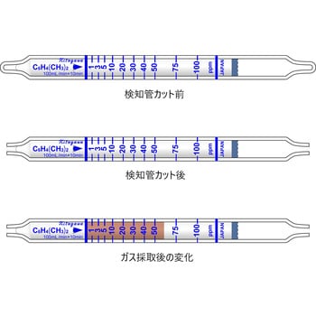 変色した先端の目盛を読み取るだけでガス濃度が判ります。