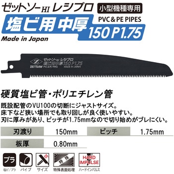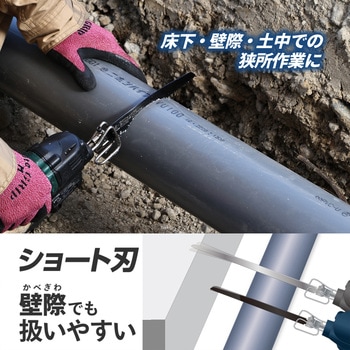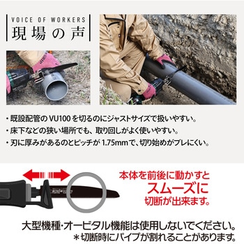 既設配管のVU100の切断にジャストサイズ。床下など狭い場所でも取り回しが良く使いやすい。刃に厚みがあり、ピッチが1.75mmなので切り始めがブレにくい。ハードインパルス処理をしているので抜群の切れ味。
