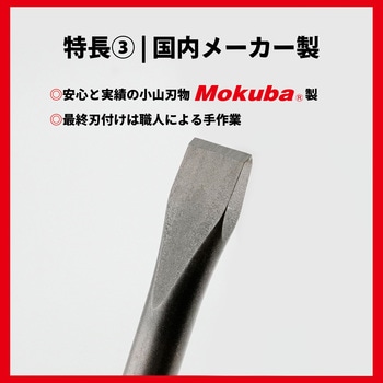 電動工具の小型化に合わせ、アプローチが短く狙いを外しにくいショートタイプ(150mm)のチゼルが誕生しました。軸が短く、打撃力を逃しません。壁や床に干渉しない快適な長さを追求しました。軸が安定する母材15Φを採用。打撃がしっかり刃先に伝わります。HRC52を誇る硬度を持ち、刃先はグラインダーで研げば復活します。安心の小山刃物・MOKUBA製。最終手付は職人による手作業で丁寧に仕上げています。