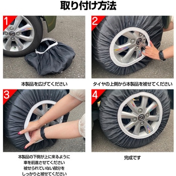 取り付け方はとってもカンタン!1.本製品を広げる、2.タイヤの上側から被せる、3.車を少し前進させ、残りの部分をしっかり被せる、4.全体の形を整えて完成