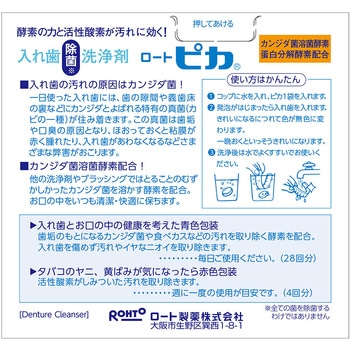 「ピカ」はデンチャープラークの微生物学的な研究を背景に、全国の歯科補綴学の先生方のご指導のもとに開発した入れ歯洗浄剤です。「ピカ」には2種類の洗浄剤が入っており、汚れの程度に合わせて使う仕組みになっていて、目に見える汚れも目に見えない汚れもきれいに取り除きます。(カンジタ菌を溶菌する作用はピカ独特のものです)