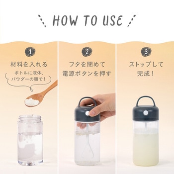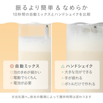 プロテインや青汁を自動ミキシング!トルネード攪拌で粉末タイプのドリンクをあっという間に攪拌。プロテイン、青汁など色々な粉末タイプのドリンクにマルチに対応。持ち運べるコンパクトサイズ。ワンタッチスタートボタン、乾電池式。