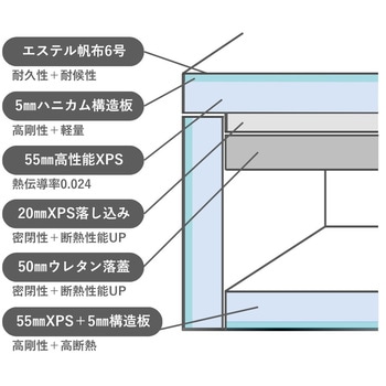 外側芯材にハニカム構造板、外装生地にエステル帆布生地を使用した高耐久仕様です。