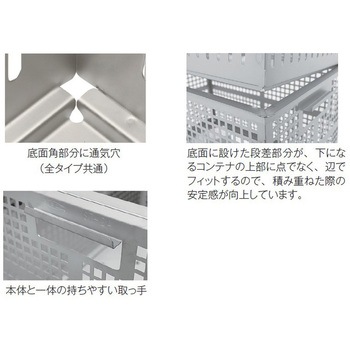 軽量ステンレスコンテナの高さ150mmタイプ野菜の運搬・保管・洗浄など、幅広い用途に対応耐久性・耐食性に優れたステンレス製持ち運びやすい軽さ積み重ねても安定感抜群本体と一体の持ちやすい取っ手高い通気性水はけの良い形状
