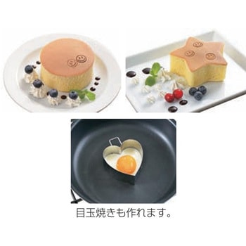 分厚いパンケーキが作れるリング。目玉焼きも作れます。きれいな形で焼くことができます。丸、ハート、星、クマ、ネコの5種類がございます。ステンレス製のため熱の通りがよく、取り扱いやすく衛生的です。