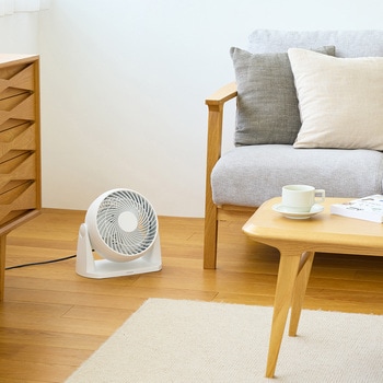 お部屋の温度ムラを抑える、コンパクトなサーキュレーター。パワフルな風で部屋の中の空気を効率よく循環します。風量は3段階で首振り角度も水平から真上まで5段階に調節可能。前グリルが取り外せて、お手入れ簡単です。