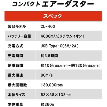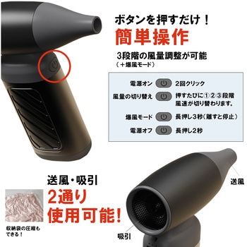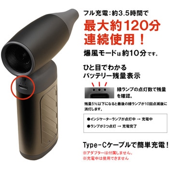 最大約120分連続使用 / フル充電約3.5時間で 爆風モード:約10分 / 低風モード:約120分の使用が可能です (※充電中は使用できません。)
