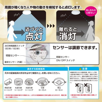 内玄関、階段、洗面所など、ちょっとしたスペースに 動体・明暗センサー付きで、周囲が暗くなり人や物の動きを検知すると点灯します 明暗センサーON/OFFスイッチ・点灯時間調節スイッチ付き 体温を検知する従来の赤外線式人感センサーと比べ周囲の気温に影響されにくく検知範囲が広い 動体センサー検知範囲、メーカー従来品人感センサーに比べ約3倍 配線工具不要の簡単取付 省エネ&長持ち
