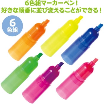並べて楽しい!気分で入れ替えできるロケットマーカー!6色のマーカーペンを自由に並び替えて使える楽しい蛍光マーカーです。使いたい色だけ上にセットしてカスタムでき、使い方の幅が広がります。スリム形状でペンケースにも収納しやすく、学校やオフィスでも活躍します。透明キャップ付きで持ち運びも安心です。お子さまの勉強から大人の手帳用まで幅広く使える便利アイテムです。
