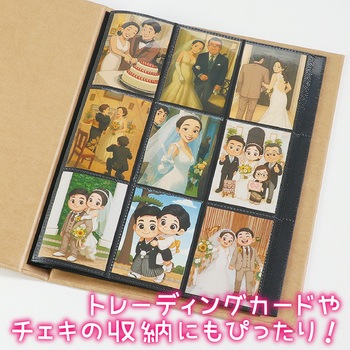 チェキやトレーディングカードを216枚収納できる、大容量アルバムです。黒台紙なので、写真が綺麗に映えます。表紙に絵を描くことができるので、デコレーションしてオリジナルのアルバムがつくれます。使用可能画材:水彩絵の具、クレヨン、油性マーカー、水彩マーカー、色えんぴつ。推し活用にデコレーションしたり、イラストを描いたり、あらゆるシーンでお使いいただけます。ハーフサイズ(63×89mm)9面(3列3段)、24ページ(216枚収納)。