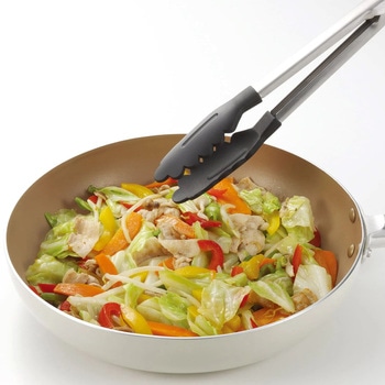 ふっ素加工やホーロー製の鍋・フライパンをキズつけにくい!ナイロン製クッキングトングです。先端がナイロン製なのでフライパンなどを傷つけにくいです。先端はしっかりつかめる形状。フックを引き上げるとトングが閉じるロック機能付きなので収納に便利です。食器洗い乾燥機対応なのでお手入れも簡単