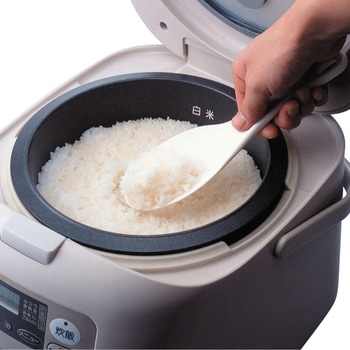 ダブルエンボス加工で、こびりつきにくく水洗いも簡単です。足付きなので置いたとき、ヘラがテーブルにつかず衛生的です。ヘラ部は縁が薄いので、ご飯をつぶしにくく、くっつきにくい。スプーン状にくぼんだヘラの形状でご飯がすくいやすくこぼれにくいです。ジャーの縁に付いてしまったご飯粒を取りやすく使いやすいです。食器洗い乾燥機対応なのでお手入れも簡単