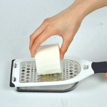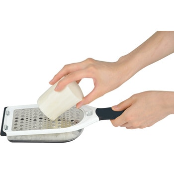 「細かめ」やわらか食感・「粗め」繊維しっかり!両面で細・粗2種類のおろしができます。特殊加工の鋭い刃で抵抗が少なくおろしやすいです。おろした後はそのまま食卓へ、 ワンタッチで外せるケース付き。端にはすべりにくいストッパーが付いているので、容器を使用しない場合でもおろしやすい仕様です。握りやすく、滑りにくい太グリップです