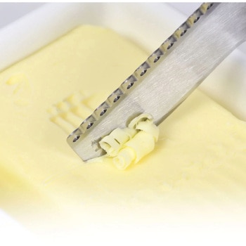バターの形を崩さず上からも横からも削れます。バターケースにぶつかりにくいアーチ形状ハンドルです。先端には穴が開いているのでバターをふんわり取れます。ちょっと使いに便利な先端ギザ刃も。食器洗い乾燥機対応なので、お手入れも簡単です