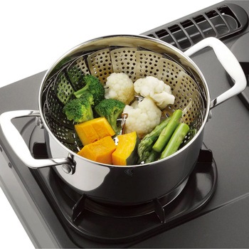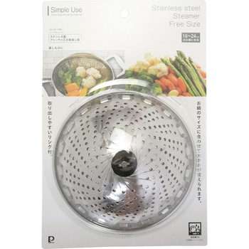 大きさ自由自在!お鍋のサイズに合わせて大きさを変えられる万能蒸し器です。ご家庭にある16~24cmの鍋にご使用いただけます。特殊設計のわん曲形状と、無数の蒸気孔が熱対流を効果的にし、水切れのよいおいしい蒸し料理に仕上げます。におい移りのしないステンレス製!食器洗い乾燥機にも対応しているので、お手入れも簡単です。野菜も蒸してヘルシーに!料理の幅が広がります。便利な取り出しリング付き。蒸し上がったら、つまみをつかんで簡単に取り出せます。お料理の型崩れも防げて便利です