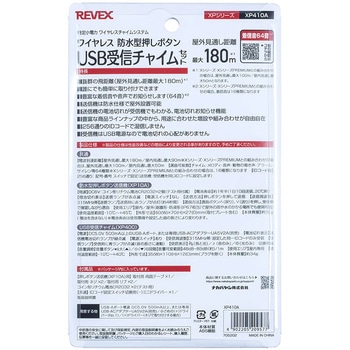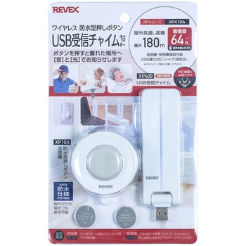 仕様ボタンを押すと送信その他【選曲可能数】64曲セット内容XP10AとXP400材質(本体)ABS使用温度範囲(℃)XP10A:-10~+46、XP400:-10~+40スイッチ【電源スイッチ】XP10A:なし、XP400:あり電源XP10A:コイン型リチウム電池CR2032×2個(付属)、XP400:DC5V 500mA以上のUSB-Aポートまたは、専用USBアダプター(別売)本体質量(g)XP10A:38、XP400:34表示【受信時】音と光/音/光【送受信ランプ】XP10A:緑ランプが点滅、XP400:赤ランプが点灯コード【デジタルID】256通り(記号-番号スイッチで設定)電池寿命XP10A:約1年半(1日10回送信、20℃時)電波到達距離(m)屋外見通し最大180、屋内見通し最大90使用場所屋内専用音量(dB)48~89/m送受信周波数(MHz)315本体寸法(幅W×高さH×奥行D)(mm)XP10A:60×70×27(プレート含む)、XP400:35×110×12(プラグ除く)音量調節【受信機】8段階内容量1セット