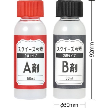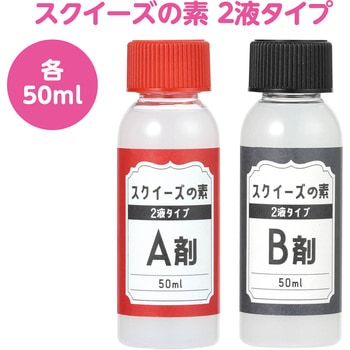 SNSで人気のスクイーズがつくれる!2種類の素を1:1で混ぜて型に流すだけで、もちもちのオリジナルスクイーズがつくれます。別売のスクイーズ着色剤やシリコンモールドを使えば、簡単にかわいいスクイーズが完成します。