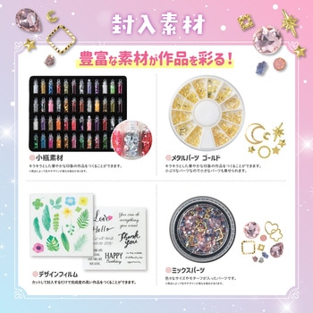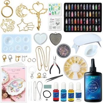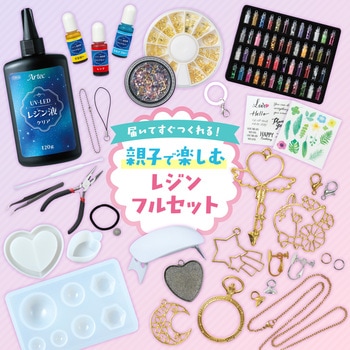 セット内容大容量レジン120g×1、レジン用着色剤各10ml×4色(レッド、スカイブルー、イエロー、ホワイト)、UV-LEDライト×1、ジェルマット×1、調色スティック×2、調色カップ×2、研磨パッド×1、精密ピンセット×1、平ヤットコ×1、モールド型×2、透明フィルム×1、キラキラ小瓶×48、メタルパーツ(シルバー&ゴールド)×24、デザインフィルム×2、ミックスパーツセット×1、ミール皿×1、空枠×5、アクセサリー用金具セット(カニカン、丸カン、ヒートンキャップ、ネックレスチェーン、イヤリング金具、アンブレラマーカー、ボールチェーン、ストラップ、ヘアゴム)×1、レジンのテクニックブック×1材質アクリル系光硬化樹脂、PET、合金、PU、合成樹脂、有機溶剤、ABS、PVC、特殊鋼(SK5)寸法(mm)225×175×45包装形態ヘッダー付き箱入り適合年齢(歳)8内容量1個