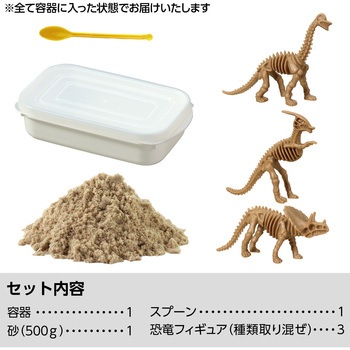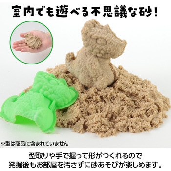 掘って、作って、蘇れ!大人気の恐竜発掘セット!砂の中に隠れた恐竜フィギュアを発掘して楽しむ、ワクワク体験型の恐竜発掘キットです。発掘後は不思議な砂でジオラマづくりもでき、2度楽しめる仕様。砂は固まりやすく崩れにくい特殊素材で、発掘後も室内でそのまま砂遊びが可能。恐竜骨格フィギュアは全12種の中からランダムで3体入り、コレクション性も高いキットです。ワークショップ・子ども会・縁日などのイベントにもぴったりな、楽しさと発見が詰まったセットです。