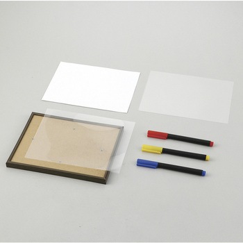 ウッドフレーム200×150mm×1、画紙用透明板200×150×0.2mm×1、画用紙150×100mm×1、油性ミリペン0.4mm3色(赤、青、黄)