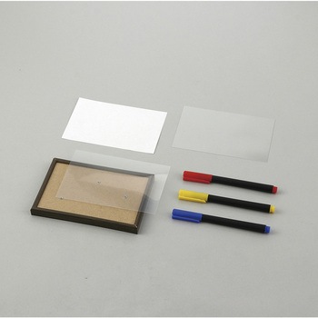 ウッドフレーム150×100mm×1、画紙用透明板150×100×0.2mm×1、画用紙150×100mm×1、油性ミリペン0.4mm3色(赤、青、黄)