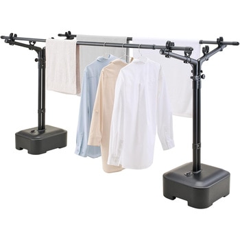 ベランダや庭で使える!マットブラックカラーのブロー台付き屋外物干し。最大4本の物干し竿を設置できます。※物干し竿は付属していません。支柱の高さは107cm~170cmで調整可能。支柱部分が360度回転。大きな箱型のブロー台付き。中の水が蒸発しにくい仕様。組立式。