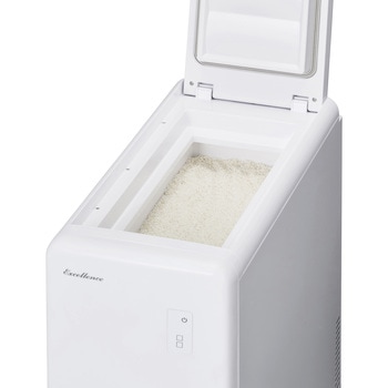 お米の酸化の原因である熱や光から守って、美味しい状態をキープしながら保存する保冷米びつです。シンプルで清潔感のあるホワイトボディ、スリムな230mm幅省スペース設計で約11kgのお米が収納可能です。引き出し式の受け皿は1回引き出すと約1合でてくる軽量機能付き。通電&米残量は一目でわかるLED表示になっています。