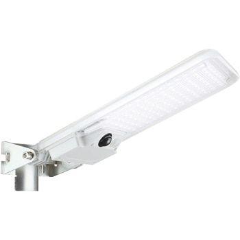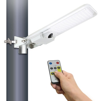 ソーラー充電式で1200ルーメン。単管やたて樋に付属のバンドで簡単取り付け。ビスで壁にも取り付け可能。本体スイッチでも、付属のリモコンでも操作可能。モード1:暗くなると人を探知して最大の明るさで点灯モード2:暗くなるとほのかに常夜灯が点灯し、人を探知すると最大の明るさで点灯モード3:暗い場所で投光器として使用でき、リモコンで明るさの調節が可能