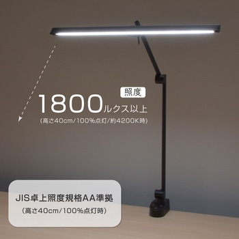 高演色Ra95のLEDを採用したクランプ式アームライトです。無段階調光と三段階調色に対応し、作業内容に合わせた最適な明るさを設定できます。JIS AA形に準拠した高照度で、デスクワークや精密作業に適した明るさを確保します。広角セードが手元を均一に照らし、目にやさしい設計です。