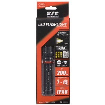 明るさ200ルーメンのLEDフラッシュライトです。HIGH/LOWの2モードに対応し、スライドフォーカスで照射角を自由に調整できます。TIMAX IC搭載で明るさを長時間キープし、IPX6の耐水性能でアウトドアや防災用途にも最適。単3乾電池1本で動作する、携帯しやすい軽量モデルです。