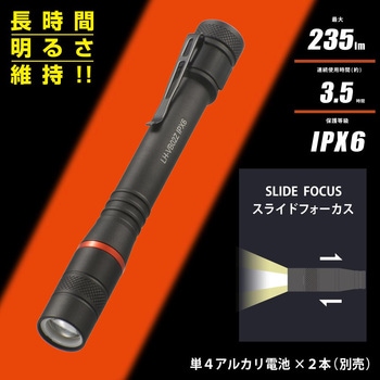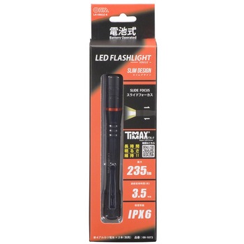 明るさ235ルーメンのLEDフラッシュライトです。スライドフォーカス機能でワイドからスポットまで照射調整が可能。TIMAX ICを搭載し、明るさを長時間維持します。IPX6の耐水性能でアウトドア・防災用途にも最適。軽量で携帯しやすいコンパクトモデルです。