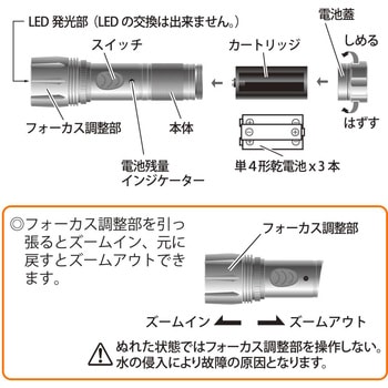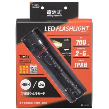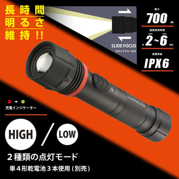 明るさ700ルーメンの高性能LEDフラッシュライトです。スライドフォーカスによりワイド照射からスポット照射まで自在に調整可能。HIGH/LOWの2モード切替に対応し、TIMAX ICにより明るさを長時間維持します。IPX6の耐水性能でアウトドアや防災用途にも最適。電池残量インジケーター付きで安心して使用できます。