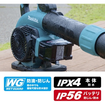 雨の中でも運転可能な防水設計、防滴・防じん「ウェットガード」&防水保護等級「IPX4」により実現。※本製品は(充電器除く)、雨の中での使用等に耐えうる製品仕様となっていますが(当社基準)、水や粉じんによって故障しないことを保証するものではありません。バッテリを装着した場合は、本体側の保護等級に準じます。