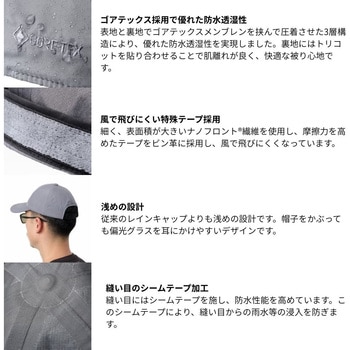 優れた機能性を持つ浅めのレインキャップゴアテックスメンブレンを挟んだ3層構造生地により、優れた防水透湿性を実現したレインキャップです。軽量で丈夫、裏地は肌離れが良く、快適な被り心地を提供します。細く表面積が大きいナノフロント(R)繊維を使用した摩擦力の高いテープをビン革に採用しているため、従来のレインキャップよりも浅めの設計でも風で飛びにくく、偏光グラスを耳にかけやすいデザインです。縫い目にはシームテープを施し、水の浸入を防ぎます。