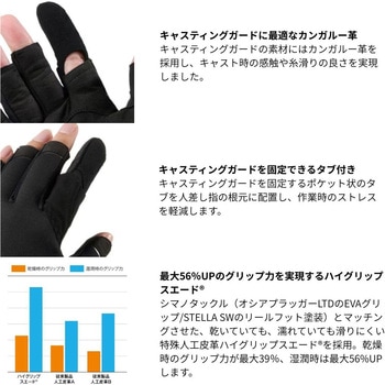 手の甲部分には、保温性と柔軟性を兼ね備えた4層構造のクロロプレン素材「タイタニューム・アルファ」を採用。第一関節までしっかりカバーするセミロング仕様により、防寒性と作業性を高いレベルで両立しています。さらに、手のひらには特殊人工皮革「ハイグリップスエード(R)」を使用。シマノのロッド(オシアプラッガーLTDのEVAグリップ)やリール(STELLA SWのリールフット)との相性も考慮されており、乾燥時で最大約39%、湿潤時では最大約56%のグリップ力向上を実現。ファイト中の安定感やキャスト精度をしっかりとサポートします。
