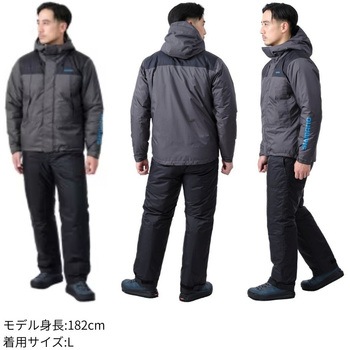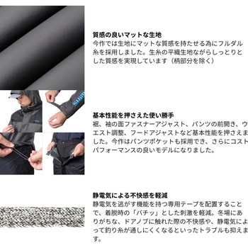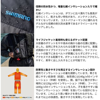 RB-057Xと比較して大幅に増量された化繊インサレーションを採用したこのジャケットは、ダウンに比べて濡れても嵩高が減りにくく、乾きも早くメンテナンスがしやすいのが特徴です。防寒性を高めるインサレーションは、水の浸入経路があると水を吸い上げてしまうため、本来の防寒性能が発揮されません。しかしこのジャケットは信頼の耐久防水基準であるドライシールドをクリアしており、インサレーションが水を吸い上げにくい防水性があります。大容量のポケットが胸から脇の位置に配置されており、自然に手を入れられる位置でありながら、膨脹式肩掛けタイプのライフジャケット着用時にも邪魔にならずにアクセスできる設計です。腰回りにはポケットが配置されていないため、膨脹式腰巻タイプのライフジャケット着用時にもポケットがベルトで潰れることがありません。釣行中にスマホをポケットに入れて写真撮影する際にも、すばやく出し入れが可能で、ハンドレストとしても使いやすい位置にあります。前モデルと比べてインサレーション量を116%に増やしていますが、ウェア全体に増やすのではなく、適所でその量を調節しています。寒さを感じやすい前身頃と後身頃には140g/m2のインサレーションを使用し、腕や脇下など動きが多い場所には120g/m2のインサレーション、フードには80g/m2のインサレーションを入れ、汗をかきやすい脇下はインサレーションを抜く設計となっています。これにより、十分な暖かさを得ながらも、これまで以上の快適性と動きやすさを実現しています。ファスナーにはポリウレタンフィルムでラミネートし、止水性を持たせる処理を施したものを採用し、水の浸入を軽減します。生地の表側にはマットな質感のフルダル糸を採用し、しっとりとした質感を実現しています。裾や袖の面ファスナーアジャスト、パンツの前開き、ウエスト調整、フードアジャストなど、基本性能を押さえながらもコストパフォーマンスに優れたモデルです。さらに、静電気を放電するテープを採用し、冬の着脱時やドアノブに触れる際の静電気の発生を軽減します。これにより、冬の静電気による不快感を軽減し、快適な着用感を提供します。