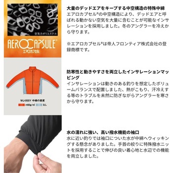 この相反する機能を高い次元でバランスさせ、形にしたのがこのインサレーションジャケット。中綿には、メンテナンス性に優れた「エアロカプセル(R)」を採用し、冬のフィッシングシーンでも体温をしっかりと守ります。