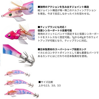 エギ×縦ジョイント。動き・音・すべてがアモラス。今までにない革新的なエギの提案。縦ジョイント構造によりアクション時に艶めかしく滑らかなドルフィンアクションを発生させる。2つのアイポジションで異なるアクションを演出。ノーズラインアイにスナップを装着すれば縦のアクションで誘い、ヘッドラインアイにスナップを装着すればスライドアクションを発生させることが可能。仮面シンカーボートⅡの装着が可能なのでティップランにも対応。ヒット時にはジョイント部がイカの動きに追従するのでバレも軽減。