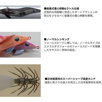 磁着式重心移動を搭載した「ぶっ飛び&安定フォール」が売りの爆釣エギ安定したフォール姿勢で定評のあるエメラルダスフォールが重心移動を搭載して新登場。ボリューム感のあるボディーにより水中のフォール姿勢が安定しスレたイカに警戒心を与えにくく、磁着式重心移動を搭載したことで飛距離が飛躍的に向上。着水しフォールに移行すれば、しっかりと磁石がウェイトを固定するので安定したフォール姿勢をキープ。いずれもラトルタイプとなっておりシャクリ時は広範囲にアピール。